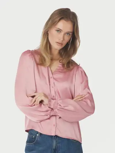 Falleg blússa frá Neo Noir úr mjúku satínefni. Módelið er 176 cm og notar stærð 36.